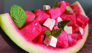 This recipe is a celebration of elegant simplicity. The rich, salty, creamy nature of the feta is wonderfully complimented by the sweet, crunchy juiciness of the watermelon while the mint plays its role as a gentle fragrant hummm to finish off the bite.